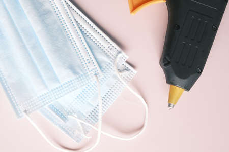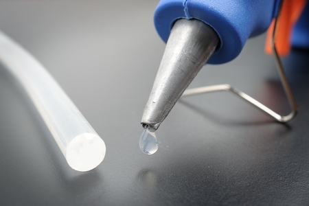 Close-up of male hand holding electric hot glue gun and using it for artwork or handicraft