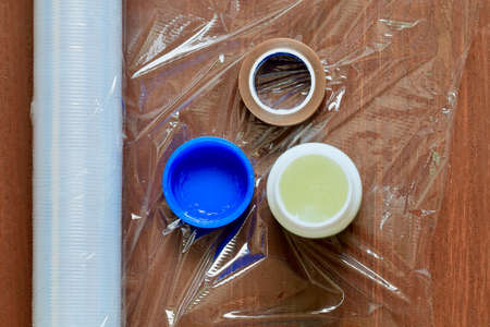 Plastic bottle caps for drinking water on a colored background. Recycling, waste separation, environmental care. Ecologycal banner.