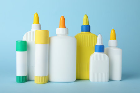 Glue in bottles, binder clip, sharpener and adhesive tape on light blue background, closeup. Space for text