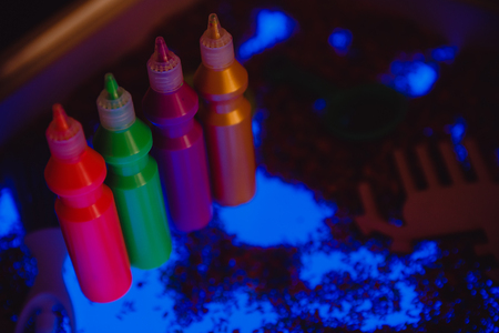 Close-up of paint for drawing on glass in neon light, washed off with water.