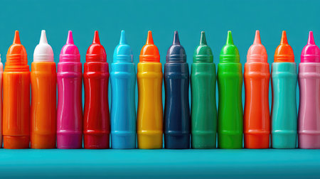 A vivid array of condiment bottles in various bold colors arranged neatly against a blue backdrop, perfect for food-themed designs, packaging, or culinary promotions.