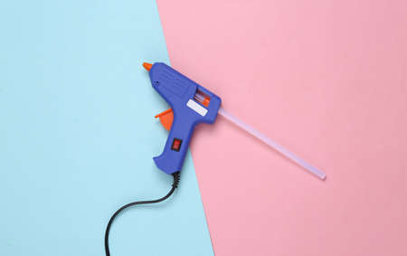 Female hand is holding hot pistol glue gun in torn hole of yellow background. Stationery tool necessary to create creative craft. Repair work appliance silicone. Minimalism concept. Copy space.