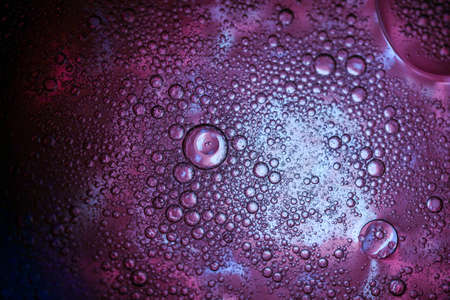 Ink bubble particles. Paint water. Defocused blue white purple color glitter oil round liquid floating on abstract bokeh background.