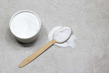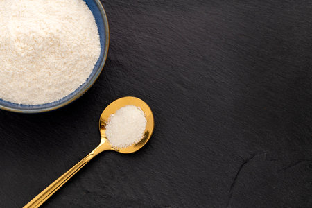 Gelatin powder also called hydrolyzed collagen - Powder in the bowl and spoon