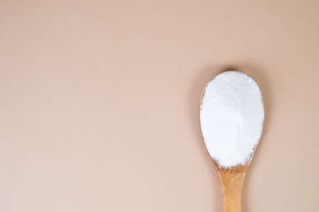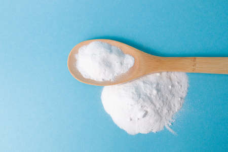 wooden spoon of soda on a pile of soda on a light blue background copy space, eco friendly lifestyle, natural means for health, cooking and cleanliness