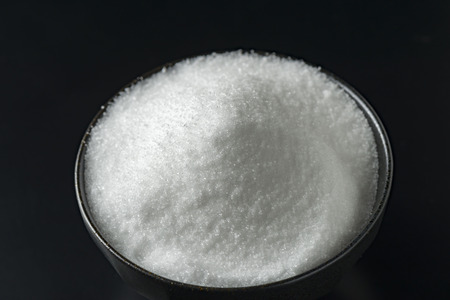 Glass bowl of Monosodium glutamate on black backround
