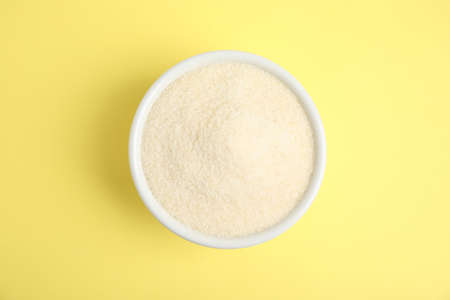 Gelatin powder in bowl on yellow background, top view