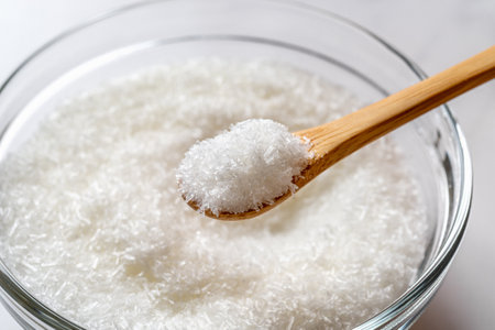 Monosodium glutamate in a wooden spoon over glass bowl full of MSG white crystals close-up. Concept of E621 flavor enhancer food additive. Top view.