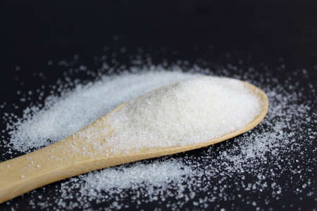 Friable sugar on a wooden spoon on a black background