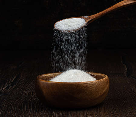 White granulated sugar is poured from a wooden spoon into a wooden bowl. copyspace.