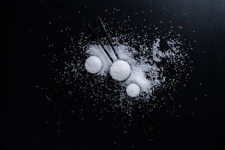 Black measuring spoons with salt on black background.