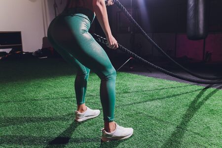 Vertical shot of athletic woman with beautiful body wearing sports clothes exercising with fitness straps at gym