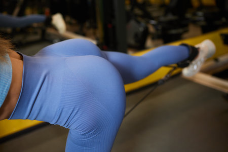 Backside close-up of woman hips woman in fit sportswear at home, domestic fitness workout. From behind of slim lady athletic glutes and legs, perfect fit. Healthy lifestyle concept. Copy ad text space