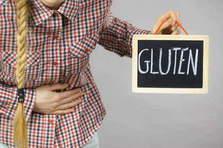 Woman holding gluten sign thinking touching her stomach feeling pain, being intolerant.