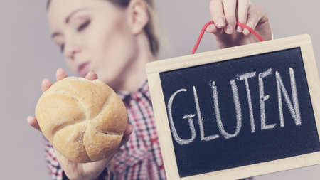 Disgusted young woman with braided hair holding small black board with gluten sign and bun bread roll. Bakery and bread allergy problem.