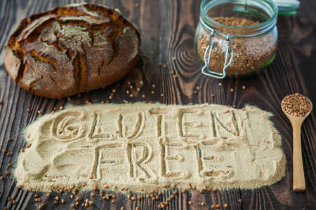 Close-up words gluten free on a buckwheat flour and a beautiful bread made of this flour. Alternative flour concept. Gluten free and healthy eating.