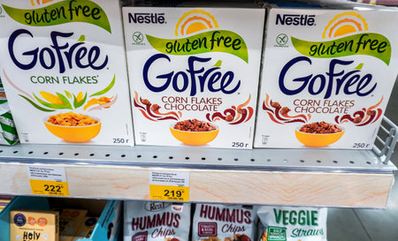Samara, Russia - March 23, 2022: Nestle corn flakes breakfast cereal. Breakfast cereal is a breakfast food made from processed cereal grains and often mixed with milk, yogurt and fruit.