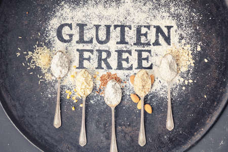 Gluten free written in flour on vintage baking sheet and spoons of various gluten free flour almond flour, buckwheat flour, rice flour, corn flour, oatmeal flour , flat lay, top view