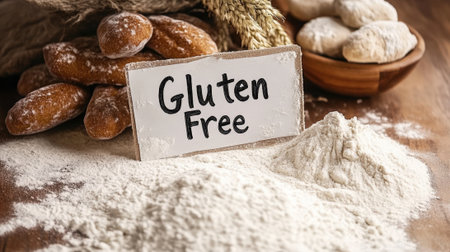 Gluten free concept. Wooden table with flour and pastry material, with the written phrase gluten free.