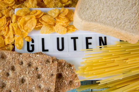 Wheat grains background with gluten inscription. Gluten is the general name for the proteins found in certain cereal grains.