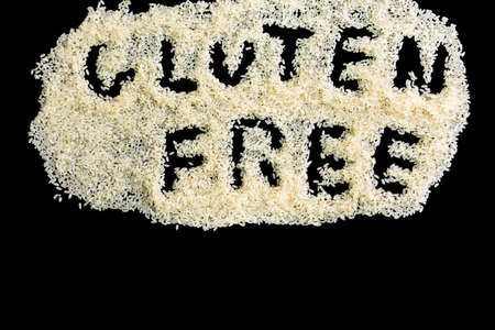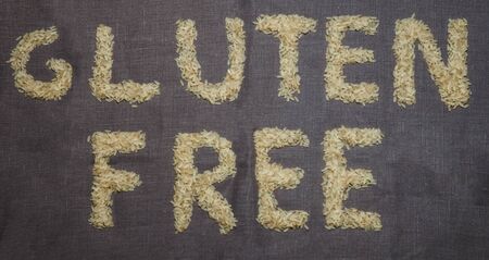 Gluten free word written with cereals on dark background. Concept of healthy lifestyle, gluten free diet.