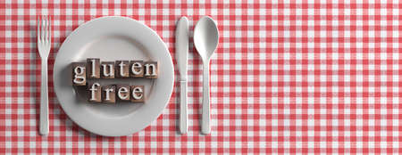 Gluten free menu, healthy eating concept. Gluten-free text on a plate, rustic red checkered tablecloth, banner, copy space. 3d illustration