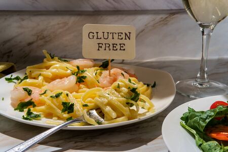 Italian fettuccine alfredo shrimp with salad and glass of white wine