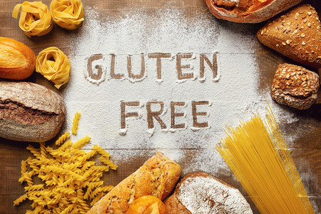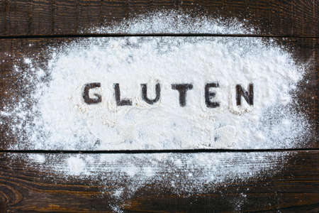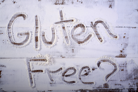 Wooden table top with gluten free question words text on flour background, horizontal picture