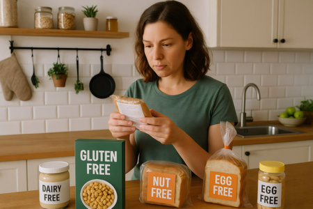 Focused woman checking ingredients and allergy information on a food package, surrounded by allergen free products in her kitchen