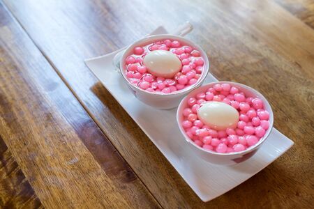Coconut milk and tangyuan in a bowl on wooden table