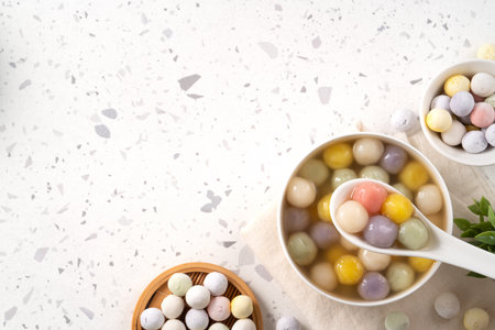 Traditional Asian sweet soup with colorful glutinous rice balls tangyuan served in warm sweet ginger syrup in white Terrazzo background