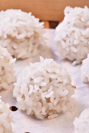 Close up of glutinous rice balls in bowls