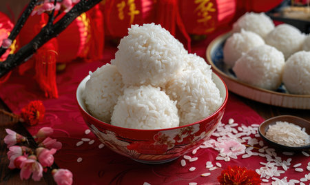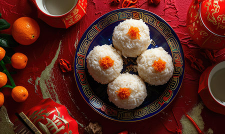 Experience the delightful presentation of traditional Asian dessert made from sweet rice, garnished with sesame seeds, ideal for festive occasions or gatherings.