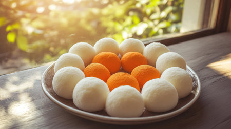 Thai steamed cotton wool cakes arranged in a circle on a ceramic plate, vibrant pastel tones highlighted by natural sunlight.