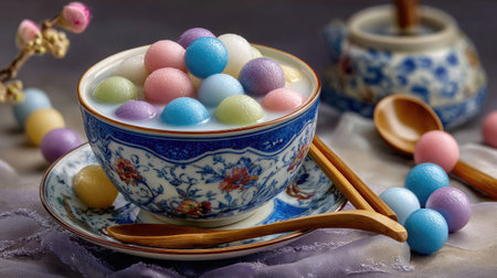 A stunning presentation of colorful sweet dumplings in a decorative bowl, showcasing an exquisite Asian dessert with vibrant pastel colors. Perfect for culinary art enthusiasts.