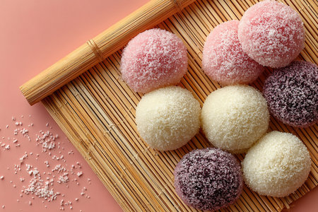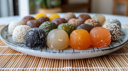 Assorted japanese mochi in a variety of flavors on minimalist plate with bamboo mat