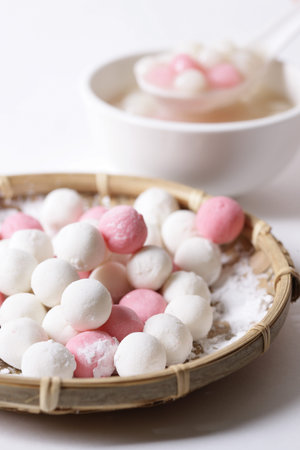 Traditional Asian sweet soup with colorful glutinous rice balls tangyuan served in warm sweet ginger syrup in white background