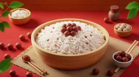 Rice in a bowl on a red background. 3d rendering