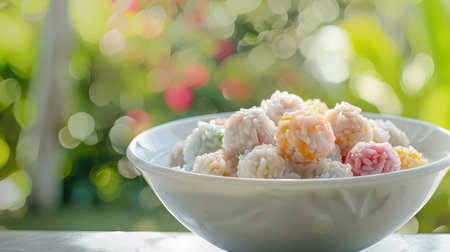 Bowl of Bua Loi with multi-colored rice balls in coconut milk, outdoor setting. Sweet traditional Thai dessert. Concept of Thai cuisine, exotic treats, Asian sweet dish, culinary. Copy space