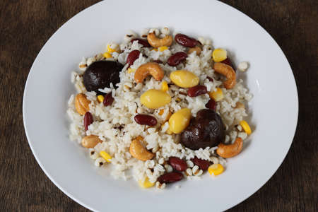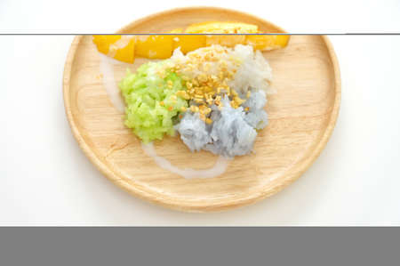 Asia - Asian eating food, Thai dessert, Various color of sticky rice in coconut cream decorated with fried green beans, on white plate isolated on white background, close up