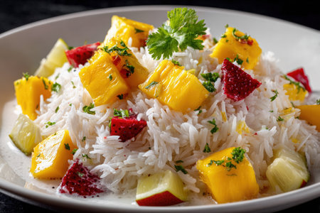 Coconut rice is beautifully presented with fresh mango, strawberries, and herbs, creating a colorful and appetizing dish that highlights tropical flavors and textures