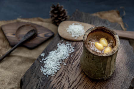 Sticky Rice Cooked with Coconut milk (Khao lam) or Glutinous rice roasted in bamboo joints on wooden, Thai dessert concept, Oblique view from the top.
