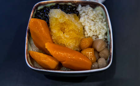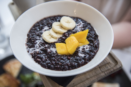 Image of very delicious and tasty black Rice With Mango and Coconut Milk seen being sold at a restaurant in Spain. The food seems to be very delicious and looks very fresh.