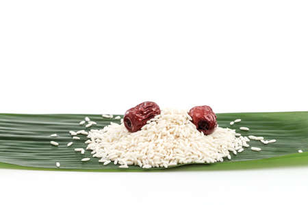 Asia - Asian eating food, Thai dessert, Sticky rice in coconut cream with sweet ripe mango, with fork on white plate and wooden tray isolated on white background, close up
