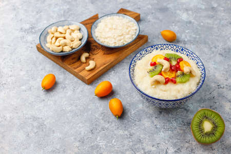 Bowl of rice flakes porridge with kiwi slices,pomegranate seeds,cumquats and cashew nuts on grey concrete background,top view