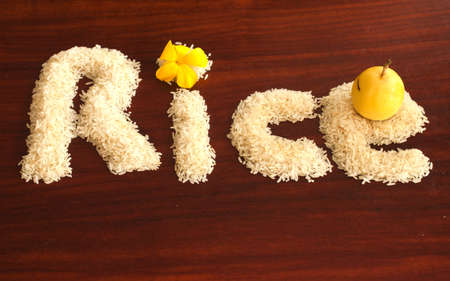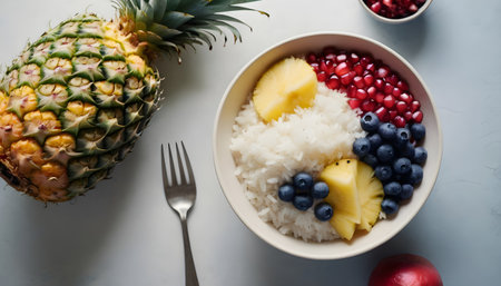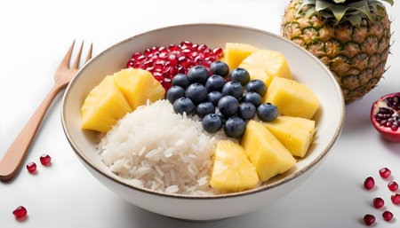 bowl of rice, pineapple, pomegranate and blueberries,on white background