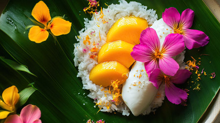 This stunning image showcases a delicious dessert featuring creamy coconut rice adorned with luscious mango slices and bright edible flowers, beautifully arranged on a banana leaf.