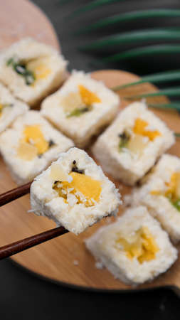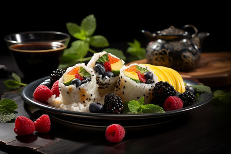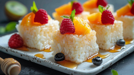 A stunning display of dessert sushi featuring vibrant rice wrapped with fresh tropical fruits. Perfect visual treat for food lovers and culinary enthusiasts.