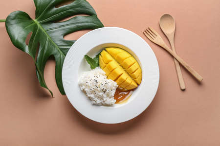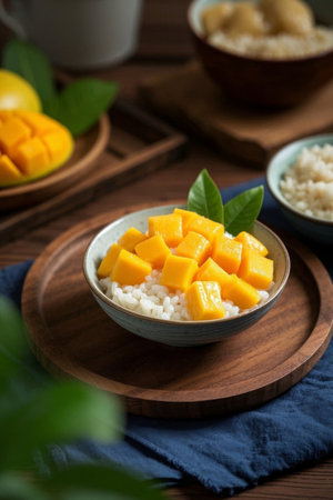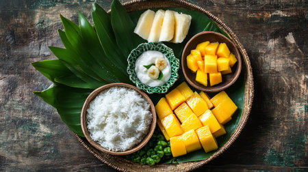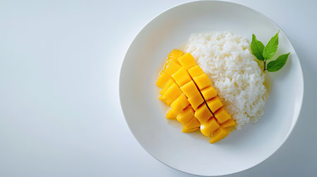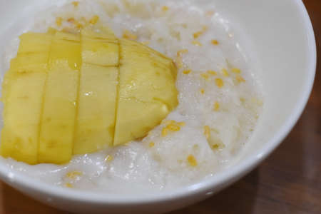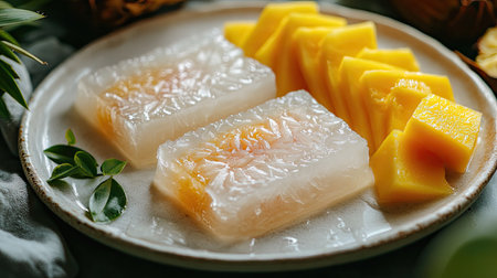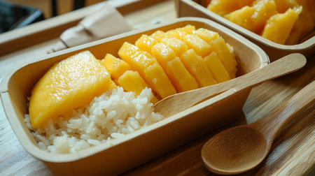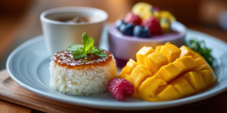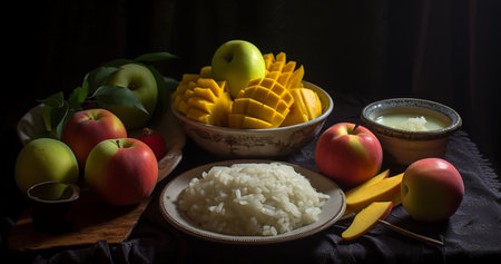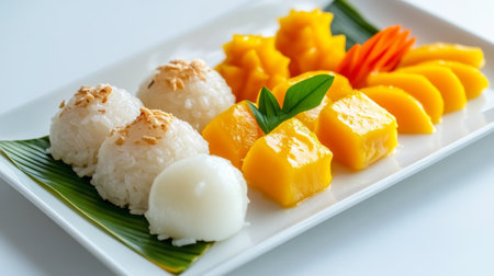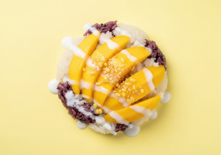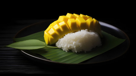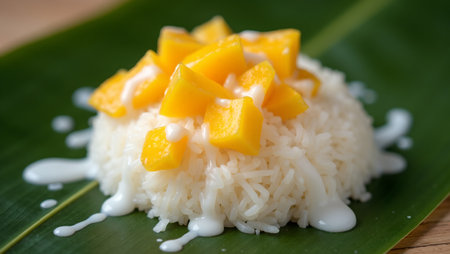 Close up shot of a traditional Thai dessert, mango sticky rice with coconut milk, a sweet and delicious treat.