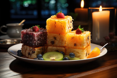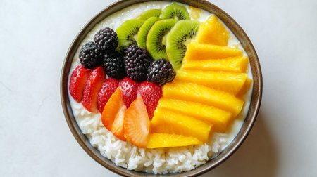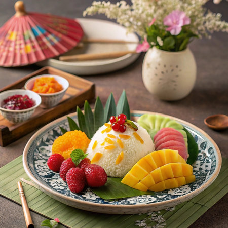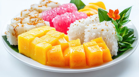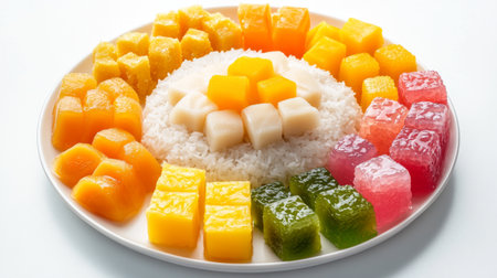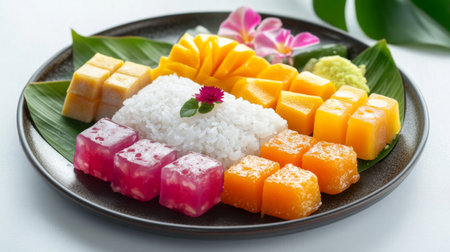 A vibrant and colorful plate featuring an assortment of tropical fruits and rice dessert. Perfect for dessert lovers and culinary enthusiasts.